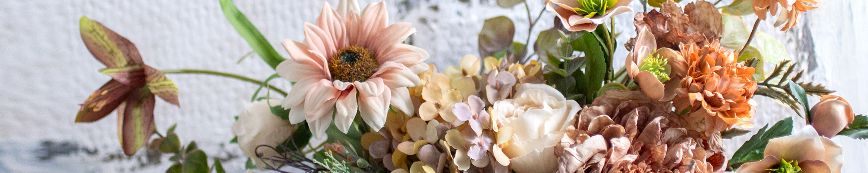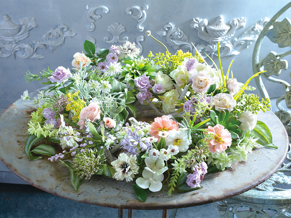 レッスンでは、アーティフィシャルフラワー(高品質造花)を生花のように生き生きと美しく見せるテクニックや、インテリアに合わせた花材の組合わせ方、飾り方も紹介しています。