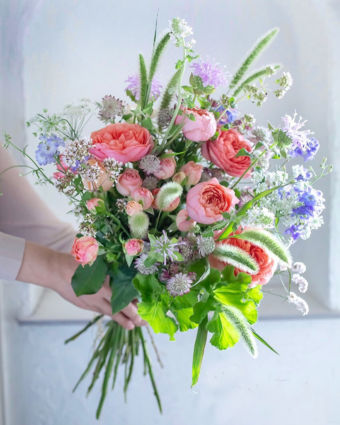 旬のお任せ花材でナチュラルラウンドのブーケを作ります。